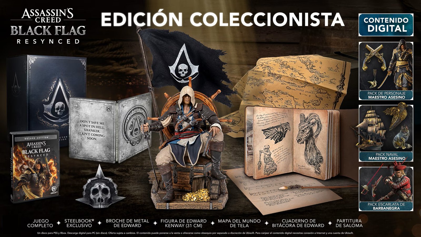 - Contenido Deluxe: pack de personaje Maestro Assassin con atuendo para Edward, espada, pistola y baratija con ventajas exclusivas. Pack naval Maestro Assassin: juego de velas, mascota del barco, vestimenta de la tripulación, timón, mascarón de proa y adornos del casco