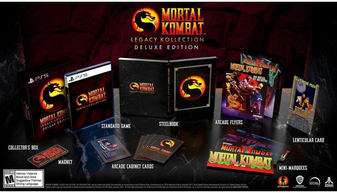 Lleva a casa la experiencia de lujo que un verdadero guerrero merece. Esta Edición Deluxe de Mortal Kombat: Legacy Kollection incluye una caja metálica, un imán, un póster, una tarjeta lenticular, volantes arcade y mucho más.
